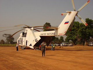 Ainda sobre a CPA Celebration, a ONU tem uma logística impressionante. Para proteger o presidente trouxeram uma toyota blindada e mais um ônibus para levar as demais autoridades em conforto. Como trazer para Yambio para onde a estrada não é boa. Num helicóptero, isso mesmo, o MI 26 russo, uma estupidez (no bom sentido) de aeronave. As fotos mostram tudo, alguns números: leva até 20 toneladas de carga, ou leva 80 soldados equipados, decola com peso total de até 56 toneladas !!! As fotos falam por si !! Ah, sobrou espaço, o pessoal colocou mais de 40 colchões ainda. O pouso e a decolagem como se fosse uma tempestade de areia !